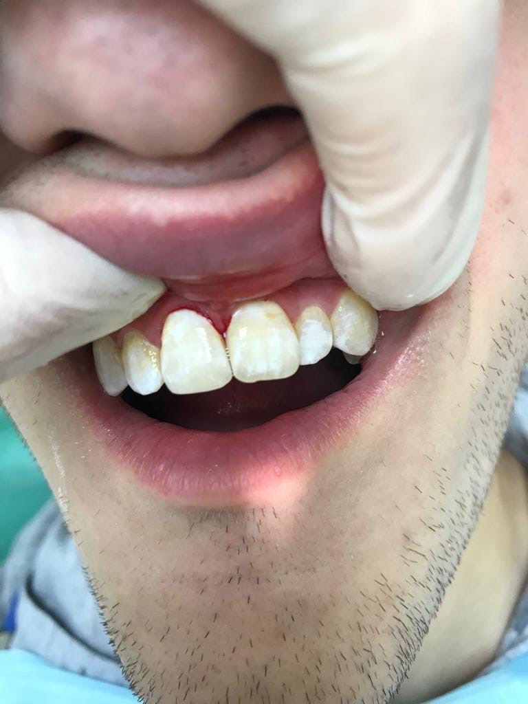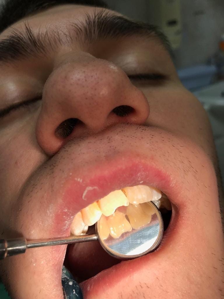 4. Пациент 19 лет, обратился с жалобами на скол зуба. При осмотре на контактных поверхностях 1.1 и 1.2 зубов обнаружены кариозные полости, на 1.1 скол в области режущего края, гигиена полости рта неудовлетворительная. Под анестезией была проведена профессиональная чистка зубов, кариозные полости обработаны, реставрация сделана с.о материалом "estelite".