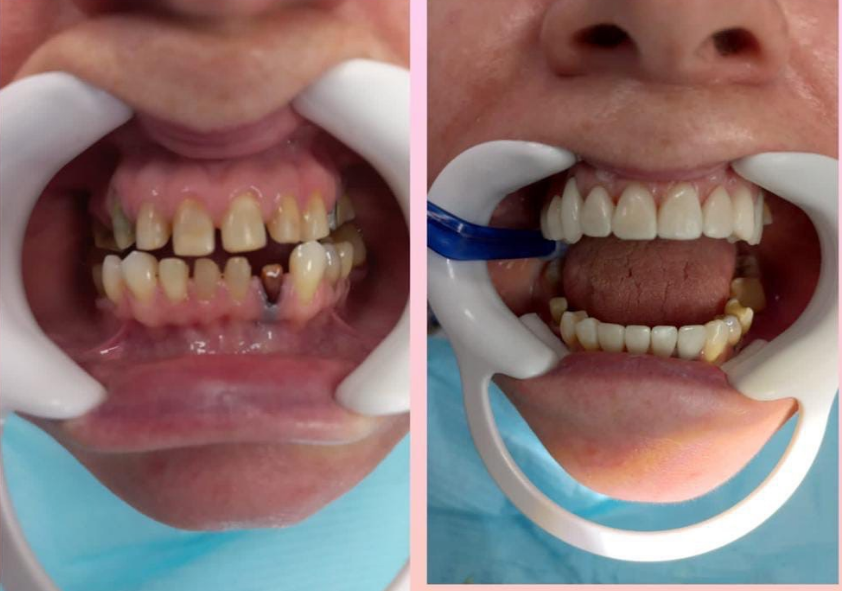 Реставрации выполнялись неоднократно в сторонних клиниках, но в скором времени они выпадали, были видны границы пломб, и конечно же окрашивание, что совсем не устраивало пациентку.